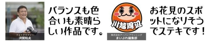 受賞者 コメント | この度は素敵な賞をいただきありがとうございます。大好きな川越の春の景色を凝縮することができた1枚と思い、自分の満足度も高い1枚です。引き続き川越の好きを探して、たくさん写真を撮りたいと思います。ありがとうございました。 |
